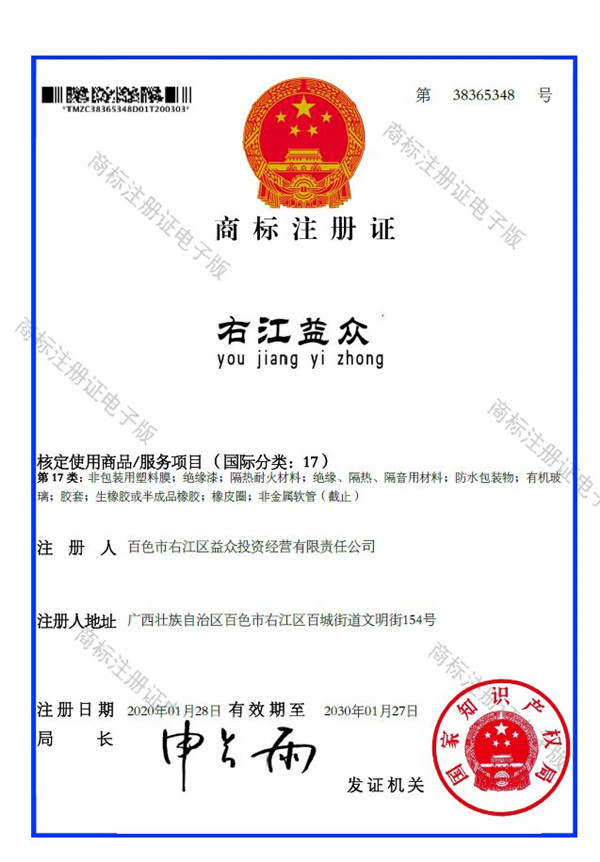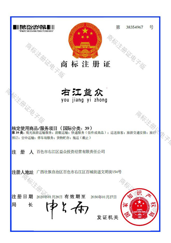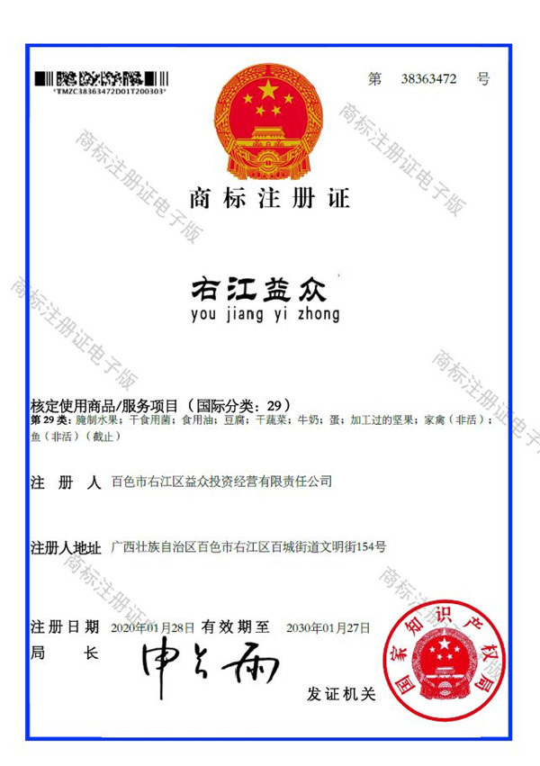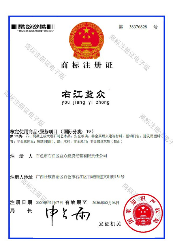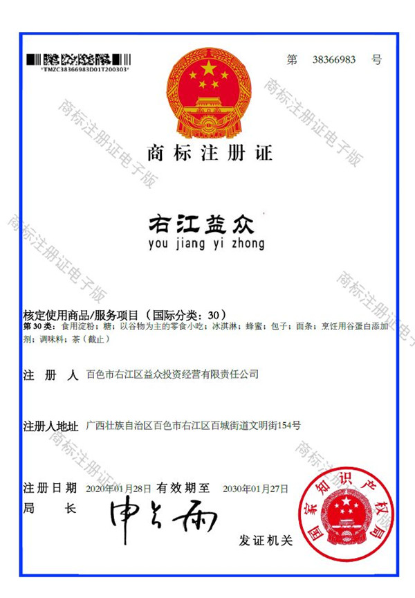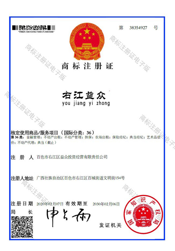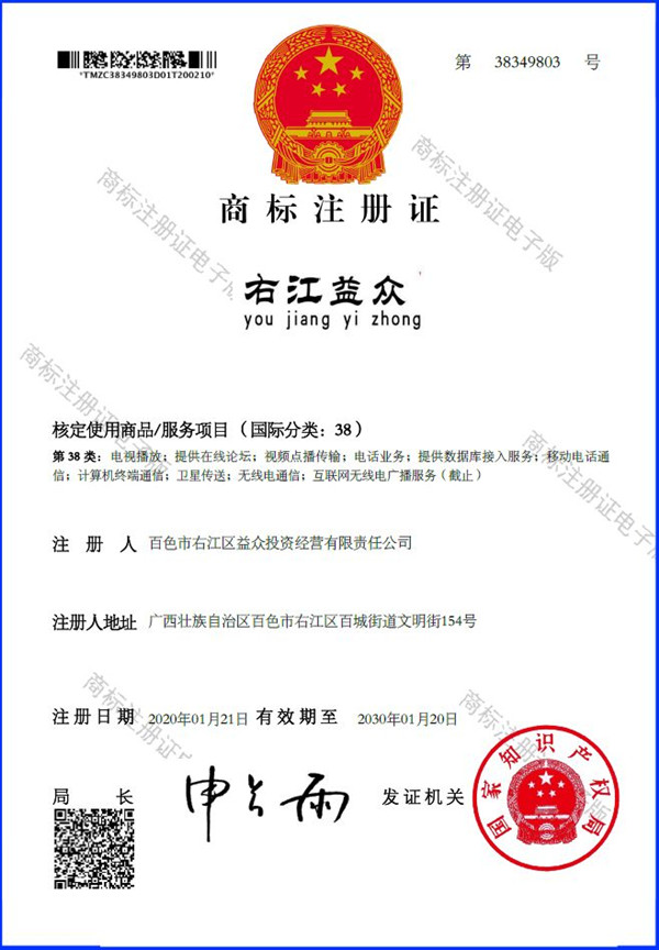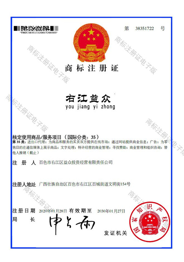 2019年4月,為樹立企業(yè)品牌形象,充分展現(xiàn)品牌價值,廣西百色益眾投資有限公司按照建設(shè)現(xiàn)代企業(yè)的方向和標(biāo)準(zhǔn),啟動品牌商標(biāo)注冊申報工作,經(jīng)過6個月的審核期和3個月的公告期,“右江益眾”45個大類商標(biāo)品牌第一時間成功獲批?!坝医姹姟逼放频某晒ψ?,有利于公司更好地參與市場競爭,同時,對于強(qiáng)化企業(yè)內(nèi)部管理、樹立良好的企業(yè)形象、提升公司美譽(yù)度也可起到積極的助推作用。