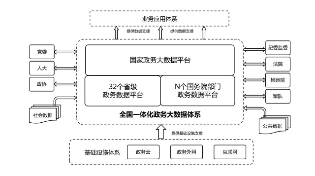 全國(guó)一體化政務(wù)大數(shù)據(jù)體系包括三類平臺(tái)和三大支撐。三類平臺(tái)為“1+32+N”框架結(jié)構(gòu)?!?”是指國(guó)家政務(wù)大數(shù)據(jù)平臺(tái),是我國(guó)政務(wù)數(shù)據(jù)管理的總樞紐、政務(wù)數(shù)據(jù)流轉(zhuǎn)的總通道、政務(wù)數(shù)據(jù)服務(wù)的總門戶;“32”是指31個(gè)?。ㄗ灾螀^(qū)、直轄市)和新疆生產(chǎn)建設(shè)兵團(tuán)統(tǒng)籌建設(shè)的省級(jí)政務(wù)數(shù)據(jù)平臺(tái),負(fù)責(zé)本地區(qū)政務(wù)數(shù)據(jù)的目錄編制、供需對(duì)接、匯聚整合、共享開(kāi)放,與國(guó)家平臺(tái)實(shí)現(xiàn)級(jí)聯(lián)對(duì)接;“N”是指國(guó)務(wù)院有關(guān)部門的政務(wù)數(shù)據(jù)平臺(tái),負(fù)責(zé)本部門本行業(yè)數(shù)據(jù)匯聚整合與供需對(duì)接,與國(guó)家平臺(tái)實(shí)現(xiàn)互聯(lián)互通,尚未建設(shè)政務(wù)數(shù)據(jù)平臺(tái)的部門,可由國(guó)家平臺(tái)提供服務(wù)支撐。三大支撐包括管理機(jī)制、標(biāo)準(zhǔn)規(guī)范、安全保障三個(gè)方面。