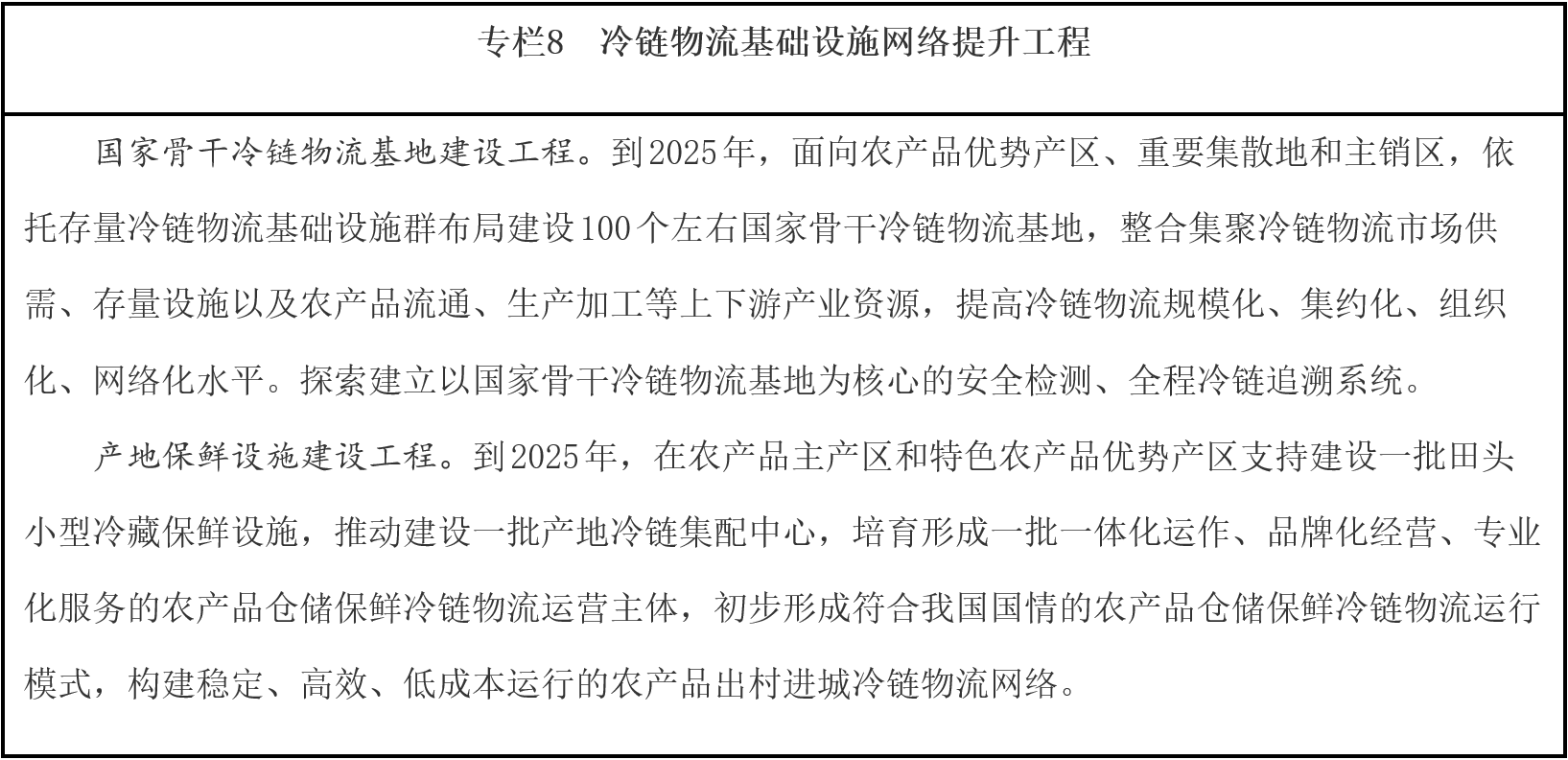 提高冷鏈物流質(zhì)量效率。大力發(fā)展鐵路冷鏈運(yùn)輸和集裝箱公鐵水聯(lián)運(yùn),對(duì)接主要農(nóng)產(chǎn)品產(chǎn)區(qū)和集散地,創(chuàng)新冷鏈物流干支銜接模式。發(fā)展“生鮮電商+產(chǎn)地直發(fā)”等冷鏈物流新業(yè)態(tài)新模式。推廣蓄冷箱、保溫箱等單元化冷鏈載器具和標(biāo)準(zhǔn)化冷藏車,促進(jìn)冷鏈物流信息互聯(lián)互通,提高冷鏈物流規(guī)?;?、標(biāo)準(zhǔn)化水平。依托國家骨干冷鏈物流基地、產(chǎn)銷冷鏈集配中心等大型冷鏈物流設(shè)施,加強(qiáng)生鮮農(nóng)產(chǎn)品檢驗(yàn)檢疫、農(nóng)獸藥殘留及防腐劑、保鮮劑、添加劑合規(guī)使用等質(zhì)量監(jiān)管。研究推廣應(yīng)用冷鏈道路運(yùn)輸電子運(yùn)單,加強(qiáng)產(chǎn)品溯源和全程溫濕度監(jiān)控,將源頭至終端的冷鏈物流全鏈條納入監(jiān)管范圍,提升冷鏈物流質(zhì)量保障水平。健全進(jìn)口冷鏈?zhǔn)称窓z驗(yàn)檢疫制度,筑牢疫情外防輸入防線。