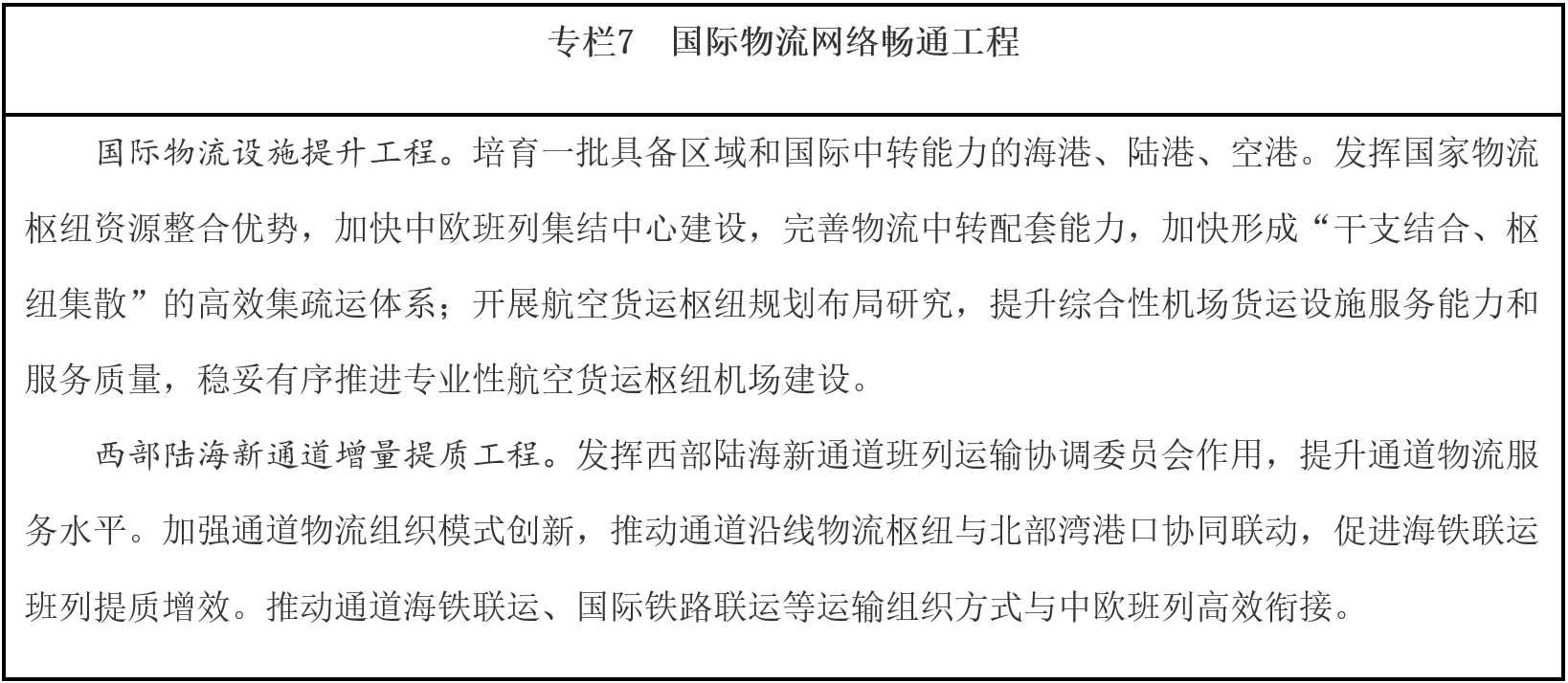 發(fā)展物流通道經(jīng)濟(jì)。圍繞共建“一帶一路”、長江經(jīng)濟(jì)帶發(fā)展等重大戰(zhàn)略實(shí)施和西部陸海新通道建設(shè),提升“四橫五縱、兩沿十廊”物流大通道沿線物流基礎(chǔ)設(shè)施支撐和服務(wù)能力,密切通道經(jīng)濟(jì)聯(lián)系,優(yōu)化通道沿線產(chǎn)業(yè)布局與分工合作體系,提高產(chǎn)業(yè)組織和要素配置能力。