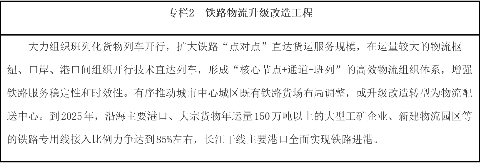推進(jìn)結(jié)構(gòu)性降成本。加快推進(jìn)鐵路專用線進(jìn)港區(qū)、連園區(qū)、接廠區(qū),合理有序推進(jìn)大宗商品等中長距離運(yùn)輸“公轉(zhuǎn)鐵”、“公轉(zhuǎn)水”。完善集裝箱公鐵聯(lián)運(yùn)銜接設(shè)施,鼓勵(lì)發(fā)展集拼集運(yùn)、模塊化運(yùn)輸、“散改集”等組織模式,發(fā)揮鐵路干線運(yùn)輸成本低和公路網(wǎng)絡(luò)靈活優(yōu)勢(shì),培育有競爭力的“門到門”公鐵聯(lián)運(yùn)服務(wù)模式,降低公鐵聯(lián)運(yùn)全程物流成本。統(tǒng)籌沿海港口綜合利用,提升大型港口基礎(chǔ)設(shè)施服務(wù)能力,提高碼頭現(xiàn)代化專業(yè)化規(guī)?;?,加快推進(jìn)鐵水聯(lián)運(yùn)銜接場(chǎng)站改造,提高港口鐵路專用線集疏網(wǎng)絡(luò)效能,優(yōu)化作業(yè)流程。完善內(nèi)河水運(yùn)網(wǎng)絡(luò),統(tǒng)籌江海直達(dá)、江海聯(lián)運(yùn)發(fā)展,發(fā)揮近海航線、長江水道、珠江水道等水運(yùn)效能,穩(wěn)步推進(jìn)貨物運(yùn)輸“公轉(zhuǎn)水”。推進(jìn)鐵水聯(lián)運(yùn)業(yè)務(wù)單證電子化,促進(jìn)鐵路、港口信息互聯(lián),實(shí)現(xiàn)鐵路現(xiàn)車、裝卸車、貨物在途、到達(dá)預(yù)確報(bào)以及港口裝卸、貨物堆存、船舶進(jìn)出港、船期艙位預(yù)定等鐵水聯(lián)運(yùn)信息交換共享。支持港口、鐵路場(chǎng)站加快完善集疏運(yùn)油氣管網(wǎng),有效對(duì)接石化等產(chǎn)業(yè)布局,提高管道運(yùn)輸比例。