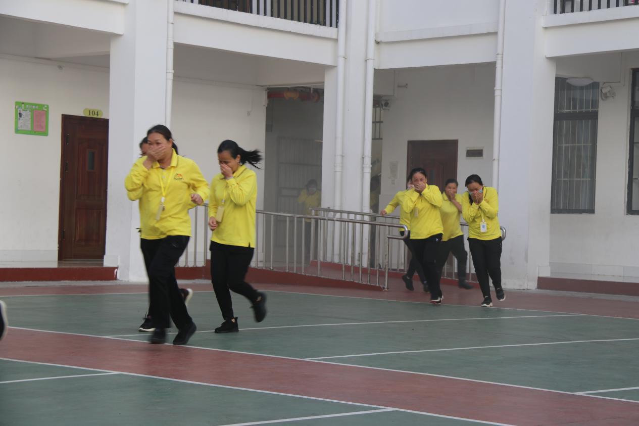 參訓(xùn)人員在模擬火災(zāi)演練中有序進行逃生