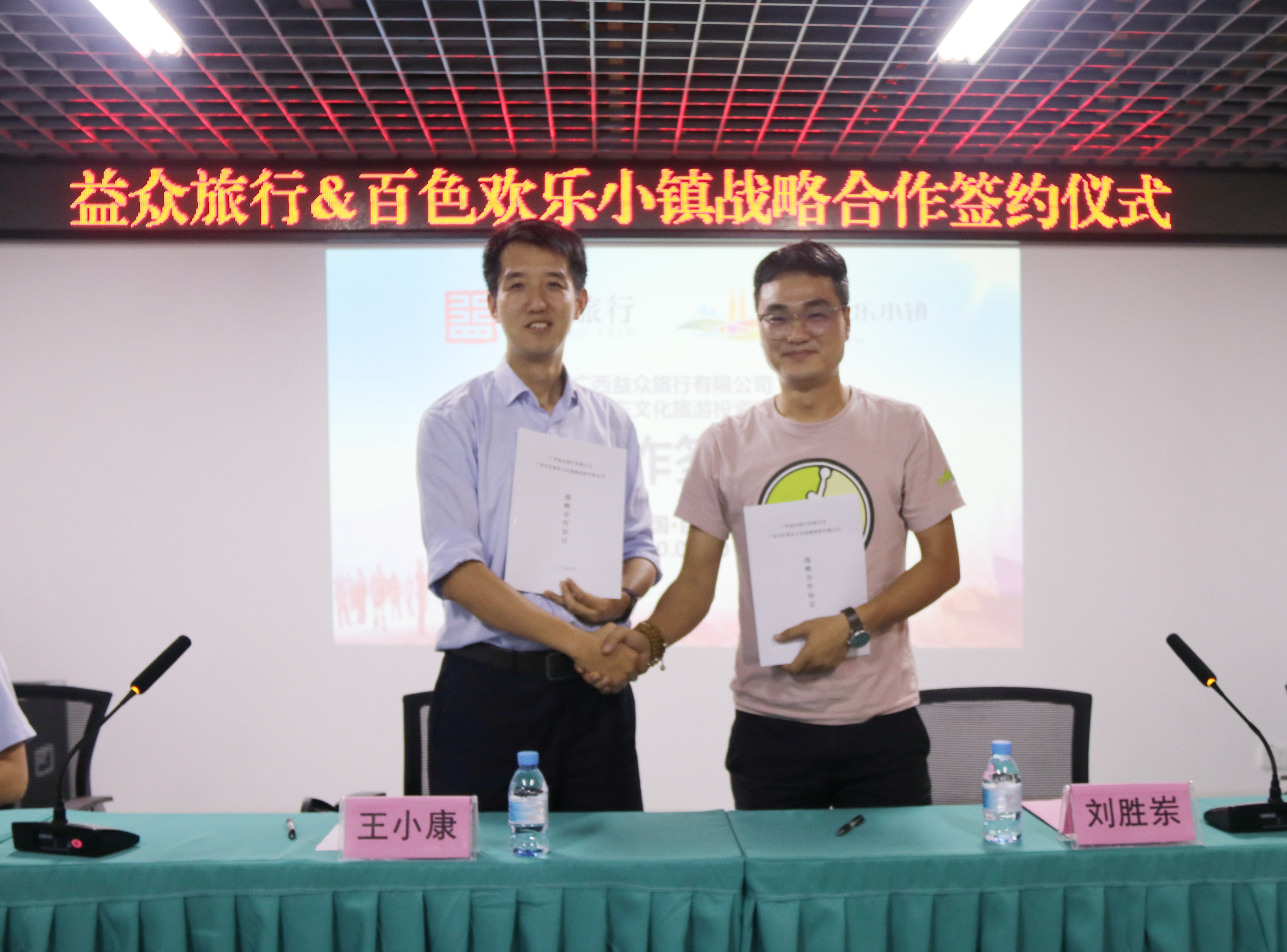 ????????9月30日,廣西益眾旅行有限公司與廣西百色智東文化旅游投資有限公司舉行戰(zhàn)略合作簽約儀式。廣西益眾旅行有限公司副總經(jīng)理王小康、百色歡樂小鎮(zhèn)總經(jīng)理方挺斌、廣西百色智東文化旅游投資有限公司副總經(jīng)理劉勝崠出席儀式。