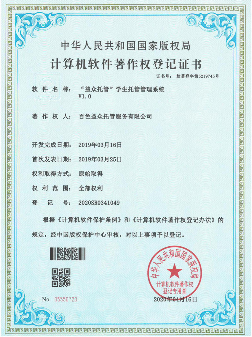 日前,經(jīng)中國版權(quán)保護(hù)中心審核,百色益眾托管服務(wù)有限公司提交的《“益眾托管”學(xué)生托管管理系統(tǒng)》符合《計(jì)算機(jī)軟件保護(hù)條例》和《計(jì)算機(jī)軟件著作權(quán)登記辦法》的相關(guān)規(guī)定,被認(rèn)定為原始取得,獲得國家版權(quán)局頒發(fā)《計(jì)算機(jī)軟件著作權(quán)登記證書》。