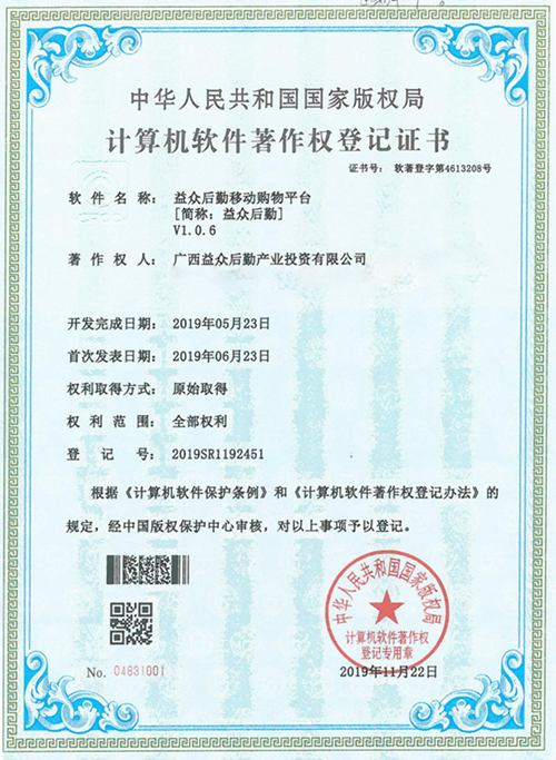 “益眾后勤移動(dòng)購(gòu)物平臺(tái)”即益眾后勤APP,是廣西益眾后勤產(chǎn)業(yè)投資有限公司與建設(shè)銀行百色分行聯(lián)合開發(fā)的線上線下交易系統(tǒng)消費(fèi)者可以通過手機(jī)APP實(shí)現(xiàn)便捷消費(fèi)。該證書的獲得是我公司在互聯(lián)網(wǎng)自主研發(fā)創(chuàng)新及自主知識(shí)產(chǎn)權(quán)保護(hù)的重大突破,是益眾后勤網(wǎng)上商城在計(jì)算機(jī)軟件領(lǐng)域里得到的權(quán)威認(rèn)可,標(biāo)志著我公司在互聯(lián)網(wǎng)軟件研發(fā)應(yīng)用領(lǐng)域邁上了一個(gè)新的臺(tái)階。