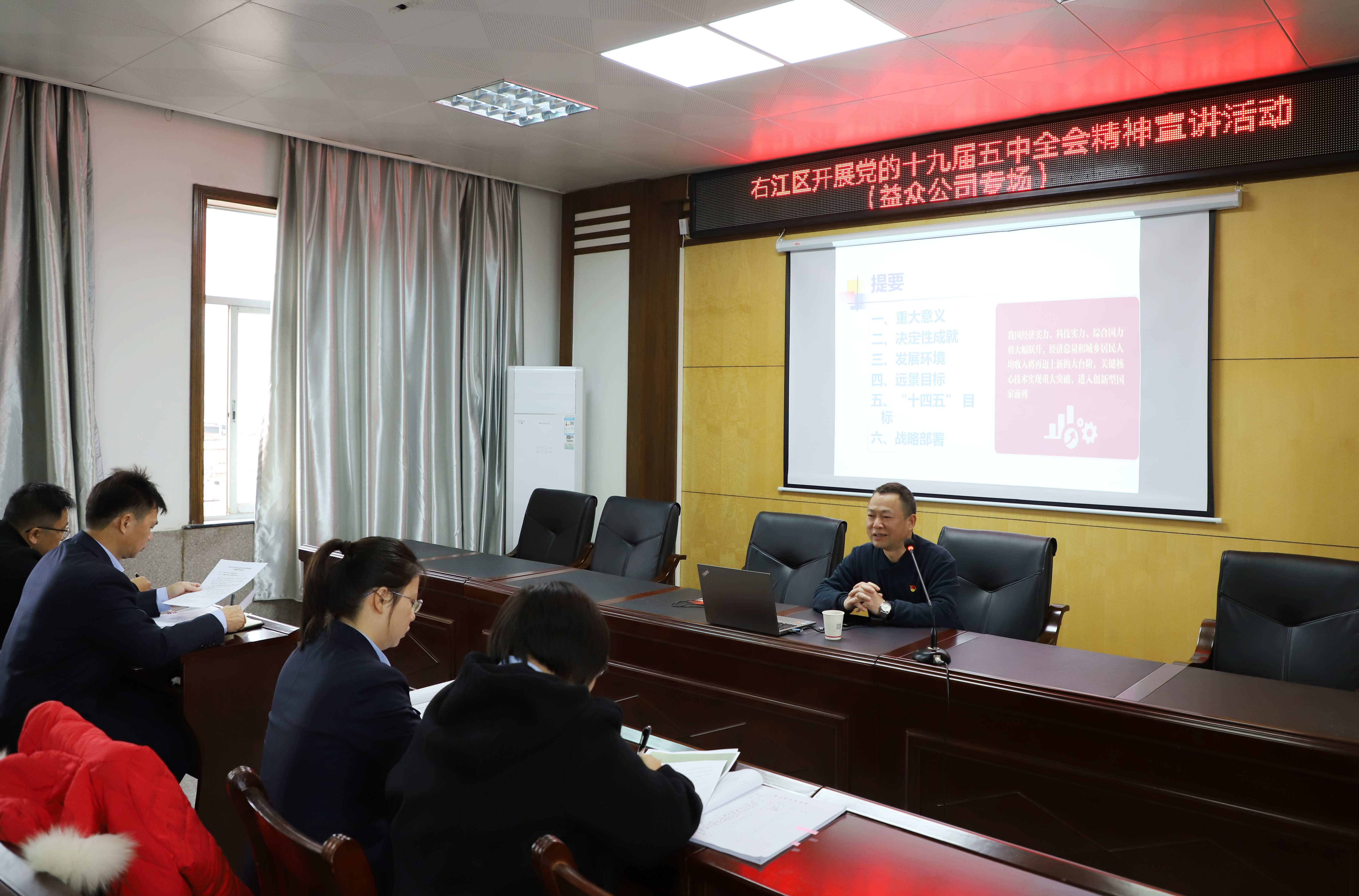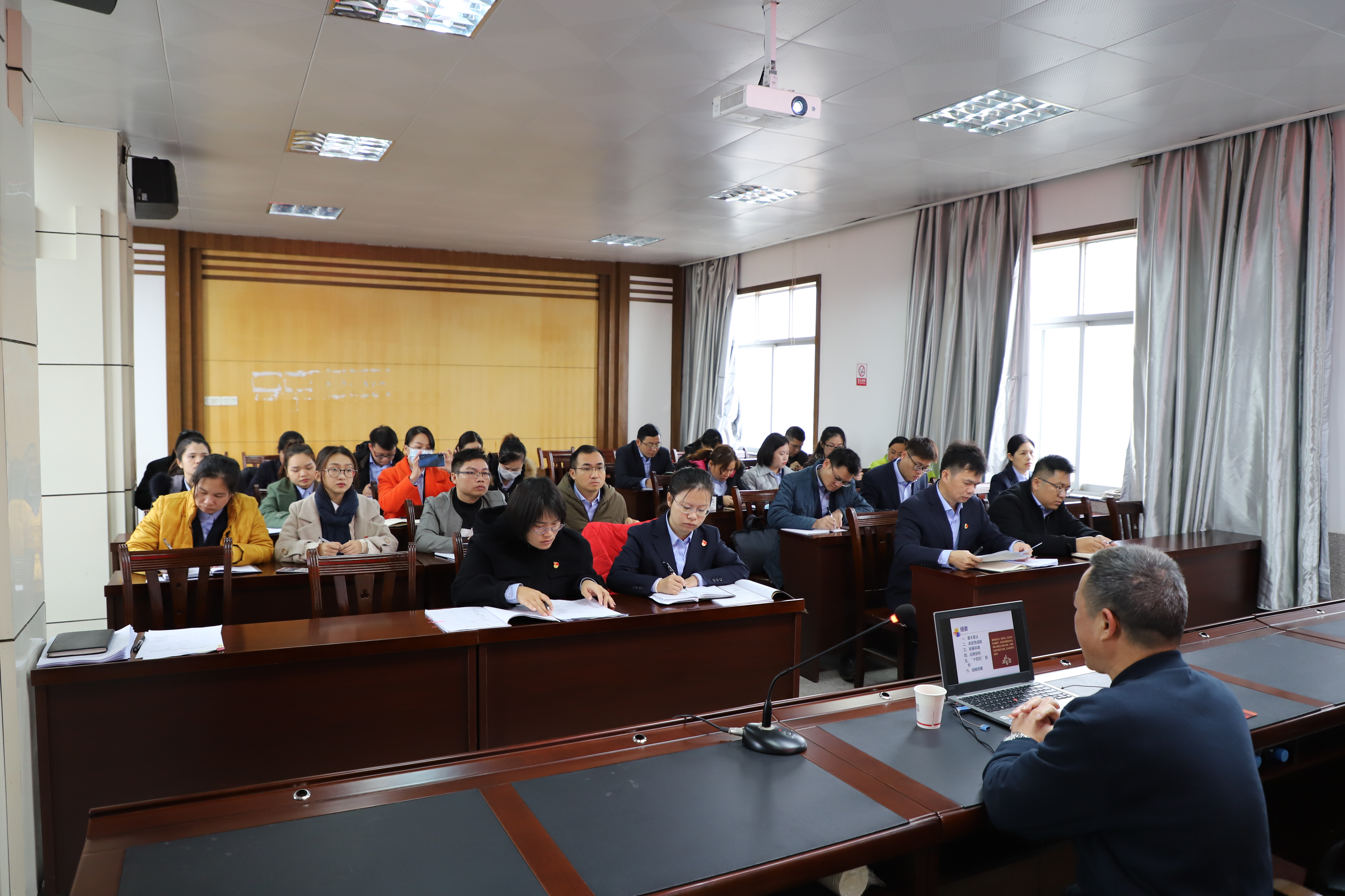 ????????右江區(qū)宣講團(tuán)黨的十九屆五中全會(huì)精神宣講報(bào)告會(huì)益眾公司專(zhuān)場(chǎng)近日舉行,宣講團(tuán)成員、區(qū)委黨校講師易祖文作宣講報(bào)告。公司領(lǐng)導(dǎo)干部、黨員、入黨積極分子約30人聆聽(tīng)報(bào)告。