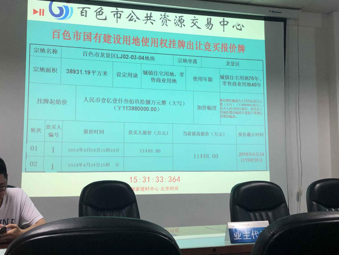 2019年4月24日,百色市龍景區(qū)LJ02-03-04地塊被景益置業(yè)公司以總價(jià)11448萬元競得,該地塊為百色市棚戶區(qū)改造項(xiàng)目--那畢片區(qū)一期改造項(xiàng)目A地塊用地。