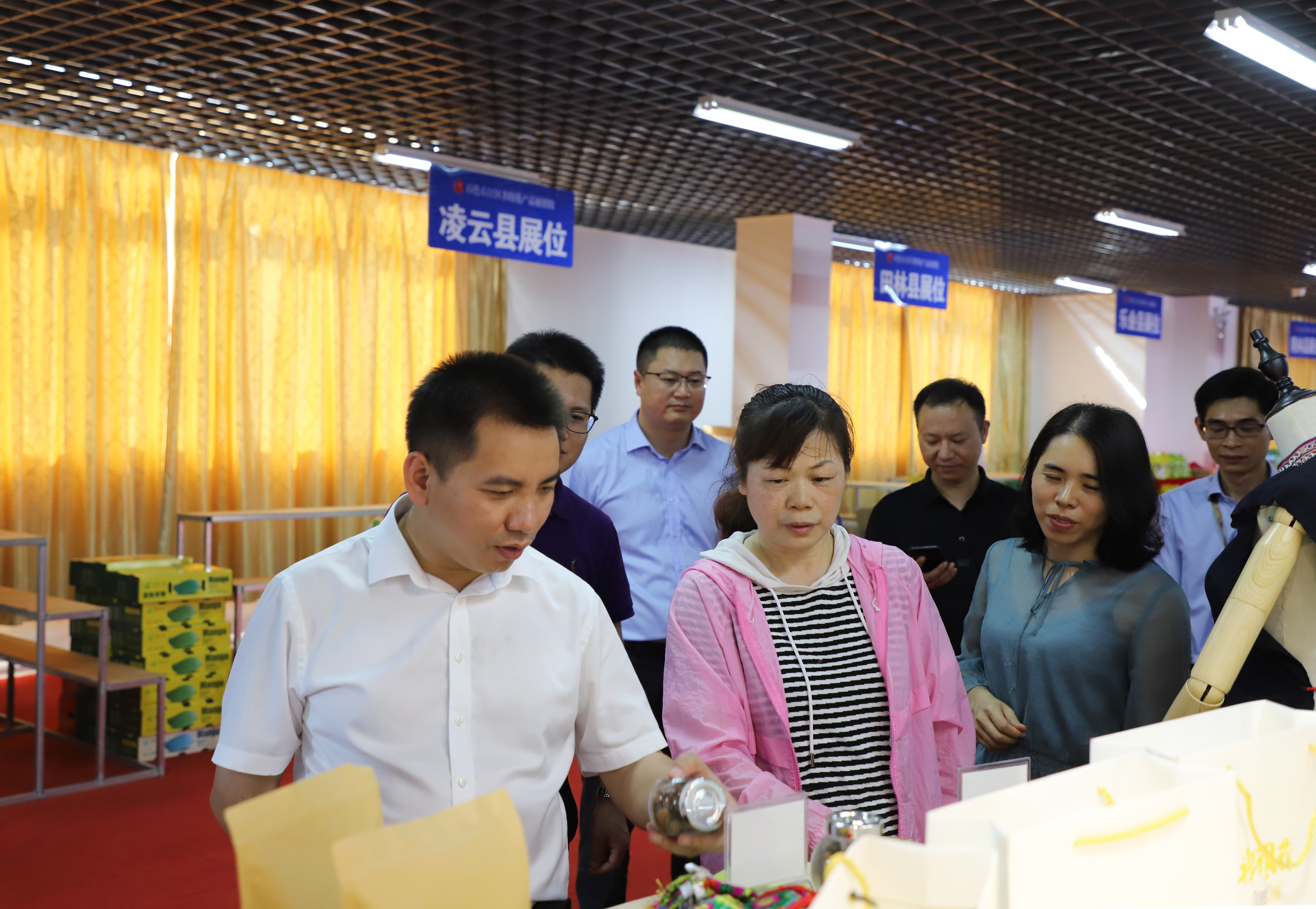 (圖為考核組在右江區(qū)名特優(yōu)產(chǎn)品展銷館參觀調(diào)研)