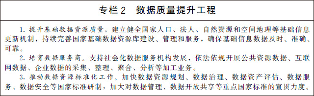 (一)強化高質(zhì)量數(shù)據(jù)要素供給。支持市場主體依法合規(guī)開展數(shù)據(jù)采集,聚焦數(shù)據(jù)的標注、清洗、脫敏、脫密、聚合、分析等環(huán)節(jié),提升數(shù)據(jù)資源處理能力,培育壯大數(shù)據(jù)服務產(chǎn)業(yè)。推動數(shù)據(jù)資源標準體系建設,提升數(shù)據(jù)管理水平和數(shù)據(jù)質(zhì)量,探索面向業(yè)務應用的共享、交換、協(xié)作和開放。加快推動各領(lǐng)域通信協(xié)議兼容統(tǒng)一,打破技術(shù)和協(xié)議壁壘,努力實現(xiàn)互通互操作,形成完整貫通的數(shù)據(jù)鏈。推動數(shù)據(jù)分類分級管理,強化數(shù)據(jù)安全風險評估、監(jiān)測預警和應急處置。深化政務數(shù)據(jù)跨層級、跨地域、跨部門有序共享。建立健全國家公共數(shù)據(jù)資源體系,統(tǒng)籌公共數(shù)據(jù)資源開發(fā)利用,推動基礎(chǔ)公共數(shù)據(jù)安全有序開放,構(gòu)建統(tǒng)一的國家公共數(shù)據(jù)開放平臺和開發(fā)利用端口,提升公共數(shù)據(jù)開放水平,釋放數(shù)據(jù)紅利。