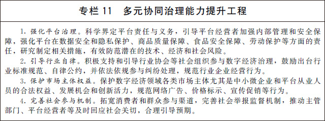 (三)完善多元共治新格局。建立完善政府、平臺、企業(yè)、行業(yè)組織和社會公眾多元參與、有效協(xié)同的數(shù)字經(jīng)濟治理新格局,形成治理合力,鼓勵良性競爭,維護公平有效市場。加快健全市場準入制度、公平競爭審查機制,完善數(shù)字經(jīng)濟公平競爭監(jiān)管制度,預防和制止濫用行政權(quán)力排除限制競爭。進一步明確平臺企業(yè)主體責任和義務,推進行業(yè)服務標準建設和行業(yè)自律,保護平臺從業(yè)人員和消費者合法權(quán)益。開展社會監(jiān)督、媒體監(jiān)督、公眾監(jiān)督,培育多元治理、協(xié)調(diào)發(fā)展新生態(tài)。鼓勵建立爭議在線解決機制和渠道,制定并公示爭議解決規(guī)則。引導社會各界積極參與推動數(shù)字經(jīng)濟治理,加強和改進反壟斷執(zhí)法,暢通多元主體訴求表達、權(quán)益保障渠道,及時化解矛盾糾紛,維護公眾利益和社會穩(wěn)定。
