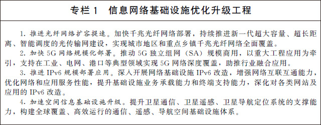 (一)加快建設信息網(wǎng)絡基礎(chǔ)設施。建設高速泛在、天地一體、云網(wǎng)融合、智能敏捷、綠色低碳、安全可控的智能化綜合性數(shù)字信息基礎(chǔ)設施。有序推進骨干網(wǎng)擴容,協(xié)同推進千兆光纖網(wǎng)絡和5G網(wǎng)絡基礎(chǔ)設施建設,推動5G商用部署和規(guī)模應用,前瞻布局第六代移動通信(6G)網(wǎng)絡技術(shù)儲備,加大6G技術(shù)研發(fā)支持力度,積極參與推動6G國際標準化工作。積極穩(wěn)妥推進空間信息基礎(chǔ)設施演進升級,加快布局衛(wèi)星通信網(wǎng)絡等,推動衛(wèi)星互聯(lián)網(wǎng)建設。提高物聯(lián)網(wǎng)在工業(yè)制造、農(nóng)業(yè)生產(chǎn)、公共服務、應急管理等領(lǐng)域的覆蓋水平,增強固移融合、寬窄結(jié)合的物聯(lián)接入能力。