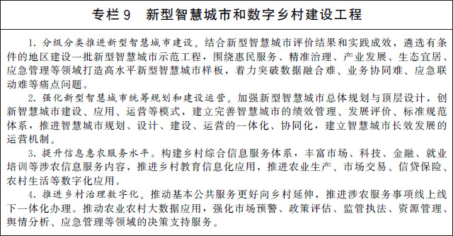 (三)推動數(shù)字城鄉(xiāng)融合發(fā)展。統(tǒng)籌推動新型智慧城市和數(shù)字鄉(xiāng)村建設,協(xié)同優(yōu)化城鄉(xiāng)公共服務。深化新型智慧城市建設,推動城市數(shù)據(jù)整合共享和業(yè)務協(xié)同,提升城市綜合管理服務能力,完善城市信息模型平臺和運行管理服務平臺,因地制宜構(gòu)建數(shù)字孿生城市。加快城市智能設施向鄉(xiāng)村延伸覆蓋,完善農(nóng)村地區(qū)信息化服務供給,推進城鄉(xiāng)要素雙向自由流動,合理配置公共資源,形成以城帶鄉(xiāng)、共建共享的數(shù)字城鄉(xiāng)融合發(fā)展格局。構(gòu)建城鄉(xiāng)常住人口動態(tài)統(tǒng)計發(fā)布機制,利用數(shù)字化手段助力提升城鄉(xiāng)基本公共服務水平。
