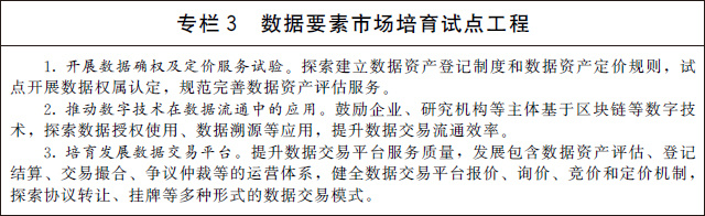 (二)加快數(shù)據(jù)要素市場化流通。加快構(gòu)建數(shù)據(jù)要素市場規(guī)則,培育市場主體、完善治理體系,促進數(shù)據(jù)要素市場流通。鼓勵市場主體探索數(shù)據(jù)資產(chǎn)定價機制,推動形成數(shù)據(jù)資產(chǎn)目錄,逐步完善數(shù)據(jù)定價體系。規(guī)范數(shù)據(jù)交易管理,培育規(guī)范的數(shù)據(jù)交易平臺和市場主體,建立健全數(shù)據(jù)資產(chǎn)評估、登記結(jié)算、交易撮合、爭議仲裁等市場運營體系,提升數(shù)據(jù)交易效率。嚴厲打擊數(shù)據(jù)黑市交易,營造安全有序的市場環(huán)境。