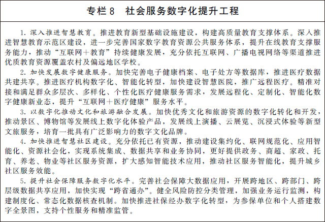(二)提升社會服務數(shù)字化普惠水平。加快推動文化教育、醫(yī)療健康、會展旅游、體育健身等領(lǐng)域公共服務資源數(shù)字化供給和網(wǎng)絡化服務,促進優(yōu)質(zhì)資源共享復用。充分運用新型數(shù)字技術(shù),強化就業(yè)、養(yǎng)老、兒童福利、托育、家政等民生領(lǐng)域供需對接,進一步優(yōu)化資源配置。發(fā)展智慧廣電網(wǎng)絡,加快推進全國有線電視網(wǎng)絡整合和升級改造。深入開展電信普遍服務試點,提升農(nóng)村及偏遠地區(qū)網(wǎng)絡覆蓋水平。加強面向革命老區(qū)、民族地區(qū)、邊疆地區(qū)、脫貧地區(qū)的遠程服務,拓展教育、醫(yī)療、社保、對口幫扶等服務內(nèi)容,助力基本公共服務均等化。加強信息無障礙建設,提升面向特殊群體的數(shù)字化社會服務能力。促進社會服務和數(shù)字平臺深度融合,探索多領(lǐng)域跨界合作,推動醫(yī)養(yǎng)結(jié)合、文教結(jié)合、體醫(yī)結(jié)合、文旅融合。