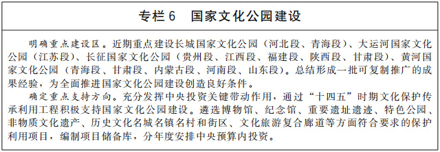推進(jìn)國家文化公園建設(shè),生動呈現(xiàn)中華文化的獨特創(chuàng)造、價值理念和鮮明特色,樹立和突出各民族共享的中華文化符號和中華民族形象,探索新時代文物和文化資源保護(hù)傳承利用新路徑,把國家文化公園建設(shè)成為傳承中華文明的歷史文化走廊、中華民族共同精神家園、提升人民生活品質(zhì)的文化和旅游體驗空間。加快建設(shè)長城、大運河、長征、黃河等國家文化公園,整合具有突出意義、重要影響、重大主題的文物和文化資源,重點建設(shè)管控保護(hù)、主題展示、文旅融合、傳統(tǒng)利用四類主體功能區(qū),實施保護(hù)傳承、研究發(fā)掘、環(huán)境配套、文旅融合、數(shù)字再現(xiàn)五大工程,突出“萬里長城”“千年運河”“兩萬五千里長征”“九曲黃河”整體辨識度。推進(jìn)優(yōu)質(zhì)文化旅游資源一體化開發(fā),科學(xué)規(guī)劃、開發(fā)文化旅游產(chǎn)品和商品。推出參觀游覽聯(lián)程聯(lián)運經(jīng)典線路,開展整體品牌塑造和營銷推介。