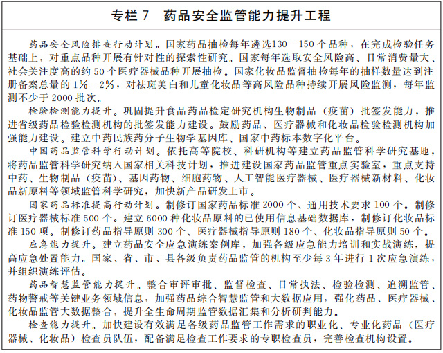 完善藥品安全監(jiān)管制度。加強(qiáng)藥物臨床試驗(yàn)核查,嚴(yán)格執(zhí)行藥品、醫(yī)療器械、化妝品等生產(chǎn)質(zhì)量管理規(guī)范,對(duì)重點(diǎn)生產(chǎn)企業(yè)開展全覆蓋檢查。開展藥品質(zhì)量提升行動(dòng),健全生物制品等高風(fēng)險(xiǎn)產(chǎn)品標(biāo)準(zhǔn)制定工作機(jī)制,提高藥品、醫(yī)療器械、化妝品標(biāo)準(zhǔn)。改革和完善疫苗監(jiān)管體制機(jī)制,提高省級(jí)藥品檢驗(yàn)檢測(cè)機(jī)構(gòu)對(duì)轄區(qū)內(nèi)生產(chǎn)的主要疫苗品種批簽發(fā)能力。深入開展無菌植入性醫(yī)療器械監(jiān)督檢查、化妝品“線上凈網(wǎng)、線下清源”等專項(xiàng)整治行動(dòng),切實(shí)規(guī)范藥品、醫(yī)療器械、化妝品市場(chǎng)秩序。