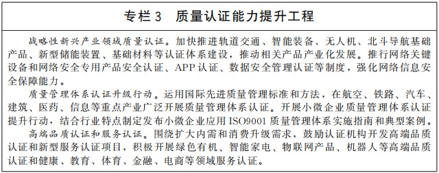 提高質(zhì)量認(rèn)證服務(wù)能力。加快構(gòu)建統(tǒng)一管理、共同實(shí)施、權(quán)威公信、通用互認(rèn)的質(zhì)量認(rèn)證體系,全面提升質(zhì)量認(rèn)證服務(wù)能力,打造一批具有國(guó)際競(jìng)爭(zhēng)力的認(rèn)證品牌。推動(dòng)完善重點(diǎn)產(chǎn)業(yè)質(zhì)量認(rèn)證制度體系,加大網(wǎng)絡(luò)安全認(rèn)證制度推行力度,加快戰(zhàn)略性新興產(chǎn)業(yè)領(lǐng)域質(zhì)量認(rèn)證制度建設(shè),大力推行高端品質(zhì)認(rèn)證和新型服務(wù)認(rèn)證,加快研究和完善國(guó)家數(shù)據(jù)安全標(biāo)準(zhǔn)與認(rèn)證認(rèn)可體系。廣泛開展質(zhì)量管理體系認(rèn)證升級(jí)行動(dòng)。健全政府、行業(yè)、社會(huì)等多層面的認(rèn)證采信機(jī)制,推動(dòng)在市場(chǎng)采購(gòu)、行業(yè)管理、行政監(jiān)管、社會(huì)治理等領(lǐng)域廣泛采信認(rèn)證結(jié)果。提升認(rèn)證行業(yè)專業(yè)化集約化水平,優(yōu)化行業(yè)布局結(jié)構(gòu),推動(dòng)認(rèn)證行業(yè)數(shù)字化發(fā)展。