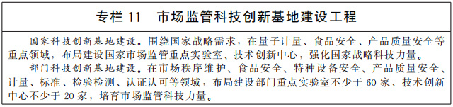 加強(qiáng)科技支撐體系建設(shè)。鼓勵(lì)市場(chǎng)監(jiān)管領(lǐng)域科研創(chuàng)新,加強(qiáng)市場(chǎng)監(jiān)管重點(diǎn)領(lǐng)域關(guān)鍵技術(shù)攻關(guān)和先進(jìn)裝備研制,布局一批國(guó)家和部門科技創(chuàng)新基地。重點(diǎn)推進(jìn)中國(guó)標(biāo)準(zhǔn)化研究院國(guó)家標(biāo)準(zhǔn)館建設(shè)工程和昌平實(shí)驗(yàn)基地二期建設(shè)工程、中國(guó)計(jì)量科學(xué)研究院實(shí)驗(yàn)基地二期建設(shè)工程、國(guó)家食品質(zhì)量安全檢(監(jiān))測(cè)能力建設(shè)工程、國(guó)家消費(fèi)品質(zhì)量安全風(fēng)險(xiǎn)監(jiān)測(cè)預(yù)警能力建設(shè)工程等建設(shè),全面提升市場(chǎng)監(jiān)管科技支撐能力。