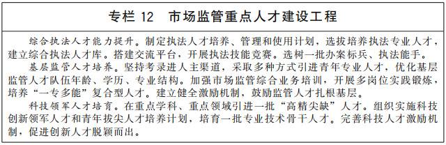 加強(qiáng)人才隊(duì)伍建設(shè)。健全人才引進(jìn)、培養(yǎng)、使用、評(píng)價(jià)、激勵(lì)機(jī)制,統(tǒng)籌推進(jìn)市場(chǎng)監(jiān)管人才隊(duì)伍建設(shè)。加快高水平市場(chǎng)監(jiān)管智庫(kù)和綜合型研究機(jī)構(gòu)建設(shè),加強(qiáng)重大理論和實(shí)踐問題戰(zhàn)略研究、決策咨詢,開展人才需求分析。推進(jìn)市場(chǎng)監(jiān)管人才培養(yǎng),加快相關(guān)學(xué)科專業(yè)建設(shè),培養(yǎng)符合市場(chǎng)監(jiān)管現(xiàn)代化需求的后備人才。在檢驗(yàn)檢測(cè)、藥品審評(píng)、檢查核查、網(wǎng)絡(luò)數(shù)據(jù)監(jiān)管、知識(shí)產(chǎn)權(quán)、質(zhì)量技術(shù)等重點(diǎn)專業(yè)領(lǐng)域,著力培養(yǎng)引進(jìn)一批“高精尖缺”人才。組織開展綜合執(zhí)法大練兵,提升基層人才隊(duì)伍能力水平。加強(qiáng)市場(chǎng)監(jiān)管文化建設(shè),增進(jìn)價(jià)值認(rèn)同、情感認(rèn)同、文化認(rèn)同,增強(qiáng)做好市場(chǎng)監(jiān)管工作的責(zé)任感和使命感。