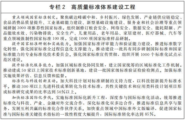 深化標(biāo)準(zhǔn)化改革創(chuàng)新。加快標(biāo)準(zhǔn)供給由政府主導(dǎo)向政府與市場(chǎng)并重轉(zhuǎn)變,標(biāo)準(zhǔn)運(yùn)用由產(chǎn)業(yè)與貿(mào)易為主向經(jīng)濟(jì)社會(huì)全域轉(zhuǎn)變,標(biāo)準(zhǔn)化工作由國(guó)內(nèi)驅(qū)動(dòng)向國(guó)內(nèi)國(guó)際相互促進(jìn)轉(zhuǎn)變,標(biāo)準(zhǔn)化發(fā)展由數(shù)量規(guī)模型向質(zhì)量效益型轉(zhuǎn)變。持續(xù)優(yōu)化政府頒布標(biāo)準(zhǔn)與市場(chǎng)自主制定標(biāo)準(zhǔn)協(xié)調(diào)配合的新型標(biāo)準(zhǔn)體系,推動(dòng)一般性產(chǎn)品、服務(wù)標(biāo)準(zhǔn)由市場(chǎng)自主制定,建立健全政府頒布標(biāo)準(zhǔn)采信市場(chǎng)自主制定標(biāo)準(zhǔn)的機(jī)制。建立法規(guī)引用標(biāo)準(zhǔn)制度,強(qiáng)化法規(guī)與標(biāo)準(zhǔn)有效協(xié)調(diào)機(jī)制,運(yùn)用標(biāo)準(zhǔn)支撐法規(guī)落地實(shí)施。加強(qiáng)標(biāo)準(zhǔn)化技術(shù)組織建設(shè),提升國(guó)家標(biāo)準(zhǔn)研制和實(shí)施能力。加強(qiáng)國(guó)家技術(shù)標(biāo)準(zhǔn)創(chuàng)新基地和國(guó)家級(jí)標(biāo)準(zhǔn)驗(yàn)證檢驗(yàn)檢測(cè)點(diǎn)建設(shè),提升標(biāo)準(zhǔn)化技術(shù)支撐水平。實(shí)施標(biāo)準(zhǔn)全生命周期閉環(huán)管理,完善標(biāo)準(zhǔn)實(shí)施信息反饋與評(píng)估制度,建立國(guó)家標(biāo)準(zhǔn)動(dòng)態(tài)維護(hù)機(jī)制。開展對(duì)標(biāo)達(dá)標(biāo)專項(xiàng)行動(dòng),推動(dòng)團(tuán)體標(biāo)準(zhǔn)培優(yōu)計(jì)劃和企業(yè)標(biāo)準(zhǔn)領(lǐng)跑者制度實(shí)施,消除標(biāo)準(zhǔn)制定團(tuán)體培育發(fā)展的政策障礙,釋放企業(yè)、社會(huì)團(tuán)體標(biāo)準(zhǔn)化活力。