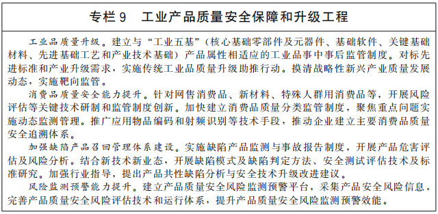 加大消費(fèi)品安全監(jiān)管力度。推動(dòng)企業(yè)建立主要消費(fèi)品質(zhì)量安全追溯體系,記錄重點(diǎn)環(huán)節(jié)過程信息,實(shí)現(xiàn)產(chǎn)品質(zhì)量安全問題可追溯。健全缺陷產(chǎn)品召回制度,加強(qiáng)大中型客貨車、新能源汽車與智能網(wǎng)聯(lián)汽車、智能家居、兒童用品、電子電器等重點(diǎn)產(chǎn)品召回管理,強(qiáng)化重大案件調(diào)查與召回后續(xù)監(jiān)督工作,完善缺陷產(chǎn)品召回技術(shù)支撐體系。完善產(chǎn)品傷害監(jiān)測(cè)制度,拓寬監(jiān)測(cè)信息采集渠道,增加監(jiān)測(cè)點(diǎn),推進(jìn)產(chǎn)品傷害預(yù)防干預(yù)。完善產(chǎn)品質(zhì)量安全事故強(qiáng)制報(bào)告和調(diào)查處理制度,提高質(zhì)量安全事故人身傷害賠償標(biāo)準(zhǔn)。