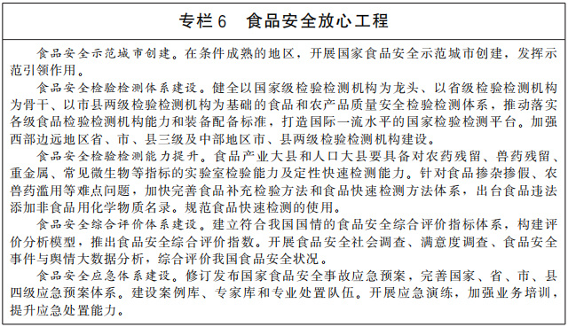 加強(qiáng)食品安全源頭治理。加強(qiáng)食品全鏈條質(zhì)量安全監(jiān)管,推進(jìn)食品安全放心工程建設(shè)攻堅(jiān)行動(dòng),加大重點(diǎn)領(lǐng)域食品安全問題聯(lián)合整治力度。提高糧食收儲(chǔ)質(zhì)量,防止不符合食品安全標(biāo)準(zhǔn)的糧食流入口糧市場(chǎng)和食品生產(chǎn)企業(yè)。加快制修訂農(nóng)藥殘留、獸藥殘留、重金屬、食品污染物、致病性微生物等食品安全通用標(biāo)準(zhǔn),推進(jìn)產(chǎn)業(yè)發(fā)展和監(jiān)管急需的食品安全基礎(chǔ)標(biāo)準(zhǔn)、產(chǎn)品標(biāo)準(zhǔn)、標(biāo)簽標(biāo)準(zhǔn)、配套檢驗(yàn)方法標(biāo)準(zhǔn)制修訂,完善食品添加劑、食品相關(guān)產(chǎn)品等標(biāo)準(zhǔn)。加快食品相關(guān)標(biāo)準(zhǔn)樣品研制。加強(qiáng)進(jìn)口食品安全監(jiān)管,嚴(yán)防輸入型食品安全風(fēng)險(xiǎn)。實(shí)施農(nóng)產(chǎn)品原產(chǎn)地追溯促進(jìn)行動(dòng),打造追溯管理規(guī)范、市場(chǎng)機(jī)制成熟、帶動(dòng)能力強(qiáng)的農(nóng)產(chǎn)品追溯標(biāo)桿企業(yè),推動(dòng)全程追溯協(xié)作和示范推廣。