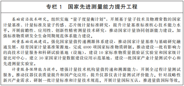 構(gòu)建現(xiàn)代先進(jìn)測(cè)量體系。加強(qiáng)以量子計(jì)量為核心的先進(jìn)測(cè)量體系建設(shè),加快建立新一代國(guó)家計(jì)量基準(zhǔn),推進(jìn)社會(huì)公用計(jì)量標(biāo)準(zhǔn)升級(jí)換代,制定一批關(guān)系國(guó)計(jì)民生的重要計(jì)量技術(shù)規(guī)范。改革完善計(jì)量器具型式批準(zhǔn)、檢定、法制監(jiān)督等管理制度,對(duì)強(qiáng)制管理的計(jì)量器具目錄實(shí)施動(dòng)態(tài)調(diào)整,完善商品量、計(jì)量數(shù)據(jù)等量值監(jiān)管制度。深入推進(jìn)計(jì)量技術(shù)機(jī)構(gòu)改革創(chuàng)新發(fā)展,探索計(jì)量校準(zhǔn)市場(chǎng)和校準(zhǔn)機(jī)構(gòu)建設(shè)的有效途徑,規(guī)范計(jì)量校準(zhǔn)市場(chǎng),滿足市場(chǎng)對(duì)量值溯源和測(cè)試服務(wù)的需求。建立國(guó)家計(jì)量數(shù)據(jù)建設(shè)應(yīng)用示范基地,提升國(guó)家產(chǎn)業(yè)計(jì)量測(cè)試和能源計(jì)量能力。積極參與國(guó)際計(jì)量比對(duì),提升國(guó)際承認(rèn)的校準(zhǔn)與測(cè)量能力。