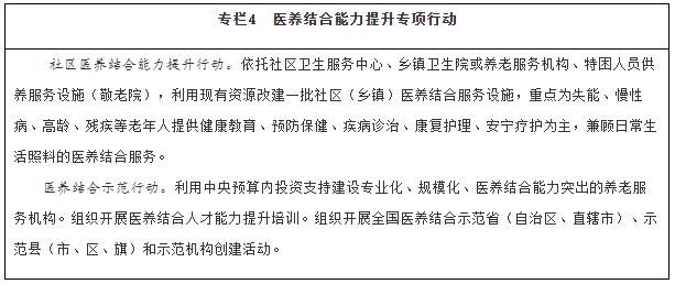 增加醫(yī)養(yǎng)結合服務供給。實施社區(qū)醫(yī)養(yǎng)結合能力提升行動。積極開展基本公共衛(wèi)生服務老年健康與醫(yī)養(yǎng)結合服務項目。支持優(yōu)撫醫(yī)院、光榮院轉型,開展醫(yī)養(yǎng)結合服務。推動社區(qū)衛(wèi)生服務中心與社區(qū)養(yǎng)老服務機構、鄉(xiāng)鎮(zhèn)衛(wèi)生院與特困人員供養(yǎng)服務設施(敬老院)、村衛(wèi)生室與農(nóng)村幸福院毗鄰建設,采取多種有效方式實現(xiàn)資源整合、服務銜接。