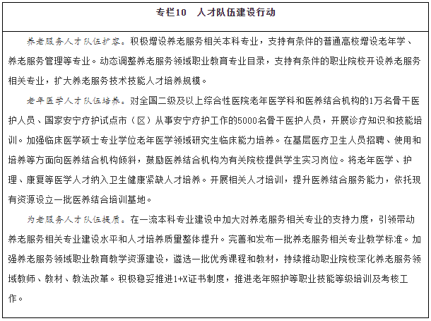 拓寬人才培養(yǎng)途徑。優(yōu)化養(yǎng)老服務專業(yè)設置,結合行業(yè)發(fā)展新業(yè)態(tài),動態(tài)調(diào)整增設相關專業(yè)并完善教學標準體系,引導普通高校、職業(yè)院校、開放大學、成人高校等加大養(yǎng)老服務人才培養(yǎng)力度。積極穩(wěn)妥推進1+X證書(“學歷證書+若干職業(yè)技能等級證書”)制度。大力推進養(yǎng)老領域產(chǎn)教融合,培育一批產(chǎn)教融合型養(yǎng)老企業(yè),支持院校和優(yōu)質機構共建合辦養(yǎng)老服務實訓基地,探索將有條件的養(yǎng)老機構發(fā)展成實習實訓點。大力發(fā)展老年學、養(yǎng)老服務管理、健康服務與管理、中醫(yī)養(yǎng)生學相關專業(yè)本科教育。引導有條件的高校開設老年學、老年醫(yī)學、老年護理學、老年心理學、老年社會學、老年營養(yǎng)學、老年服務與管理、老年社會工作等課程,鼓勵高校自主培養(yǎng)積極應對人口老齡化相關領域的高水平人才,加大新技術新應用新業(yè)態(tài)的引才用人力度,為智慧健康養(yǎng)老、老齡科研、適老化產(chǎn)品研發(fā)制造等領域培養(yǎng)引進和儲備專業(yè)人才。落實醫(yī)師區(qū)域注冊制度,鼓勵醫(yī)務人員到醫(yī)養(yǎng)結合機構(同時具備醫(yī)療衛(wèi)生資質和養(yǎng)老服務能力的醫(yī)療衛(wèi)生機構或養(yǎng)老機構)執(zhí)業(yè)。在養(yǎng)老機構舉辦的醫(yī)療機構中工作的醫(yī)務人員,可參照執(zhí)行基層醫(yī)務人員相關激勵政策。