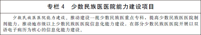 3.發(fā)展少數(shù)民族醫(yī)藥。加強(qiáng)少數(shù)民族醫(yī)醫(yī)療機(jī)構(gòu)建設(shè),提高民族地區(qū)基層醫(yī)療衛(wèi)生機(jī)構(gòu)少數(shù)民族醫(yī)藥服務(wù)能力。改善少數(shù)民族醫(yī)醫(yī)院基礎(chǔ)設(shè)施條件,加強(qiáng)少數(shù)民族醫(yī)醫(yī)院專(zhuān)科能力、制劑能力和信息化能力建設(shè)。建立符合少數(shù)民族醫(yī)醫(yī)療機(jī)構(gòu)自身特點(diǎn)和發(fā)展規(guī)律的績(jī)效評(píng)價(jià)指標(biāo)體系。加大少數(shù)民族醫(yī)藥防治重大疾病和優(yōu)勢(shì)病種研究力度,有效傳承特色診療技術(shù)和方法。鼓勵(lì)和扶持少數(shù)民族醫(yī)藥院校教育、師承教育和繼續(xù)教育。加大對(duì)少數(shù)民族醫(yī)藥的傳承保護(hù)力度,持續(xù)開(kāi)展少數(shù)民族醫(yī)藥文獻(xiàn)搶救整理工作,推動(dòng)理論創(chuàng)新和技術(shù)創(chuàng)新。